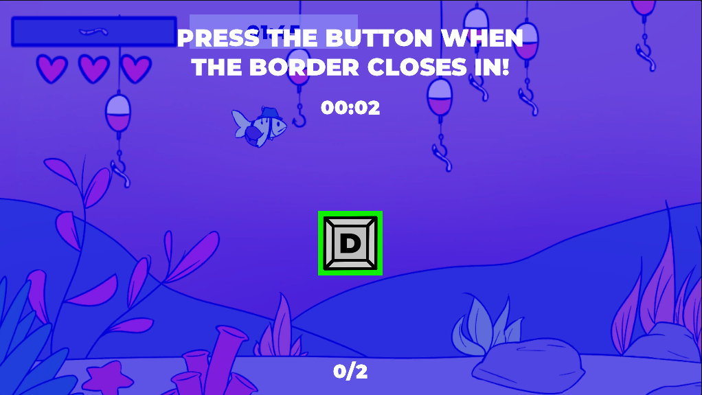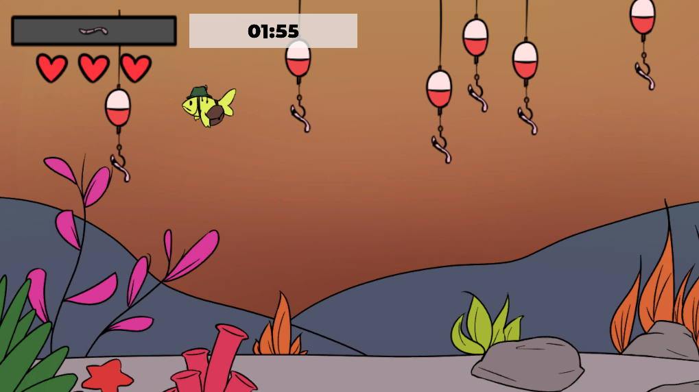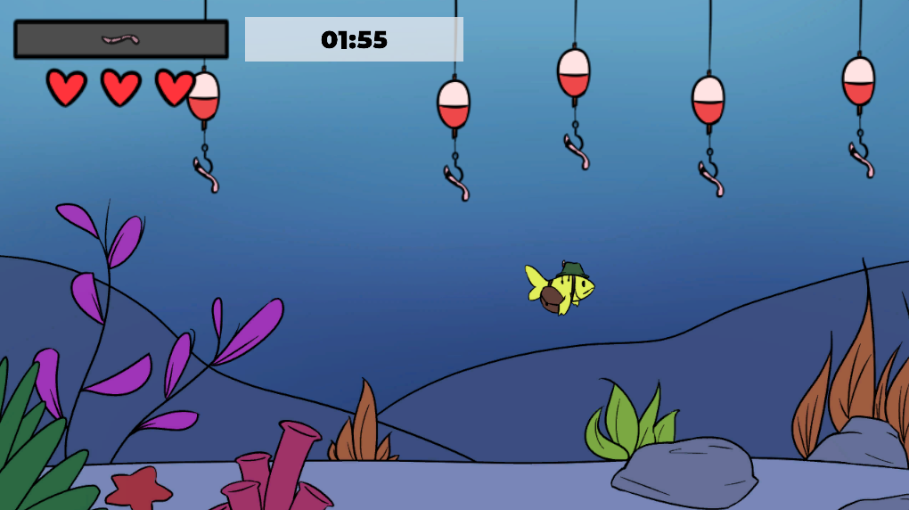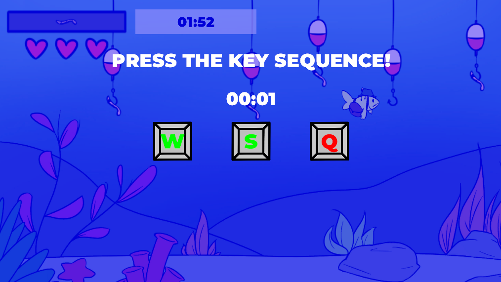 Starting with the theme of 'Roles Reversed', our team decided on the ideia of how fishing minigames worked, and so we made a fishing game, but you are the fish. Similar to fishing minigames you see in other titles, when trying to get the worm from the hook, you trigger a minigame in order to not get hooked. There are currently three minigames chosen at random when taking a bait. If you fail the minigames three times, you get hooked. The number of worms required increases with each level, as well as the speed and difficulty of the minigames.